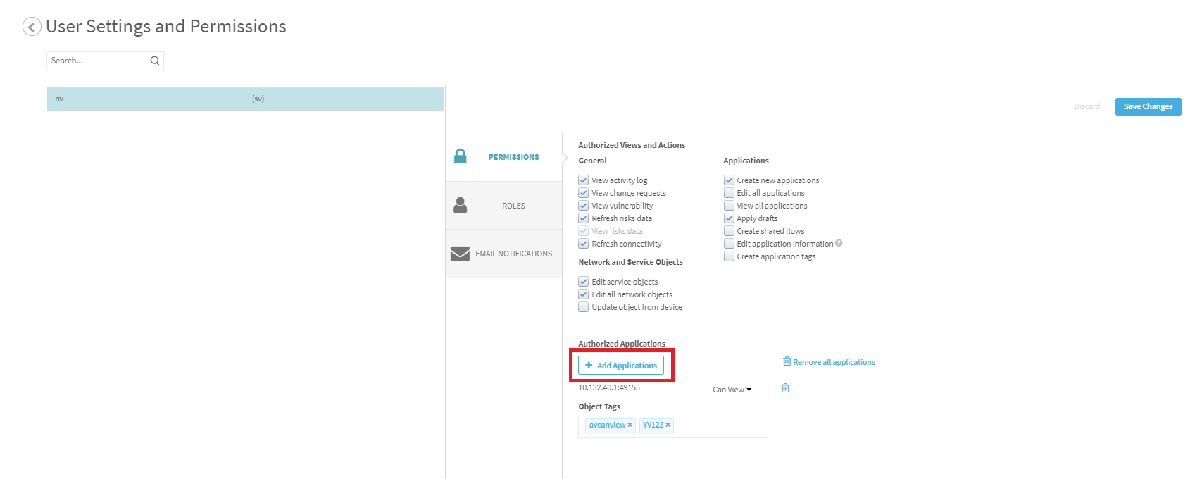 However, in version A33.10, applications must be added to the user using the Add Application button above the Object Tags area.