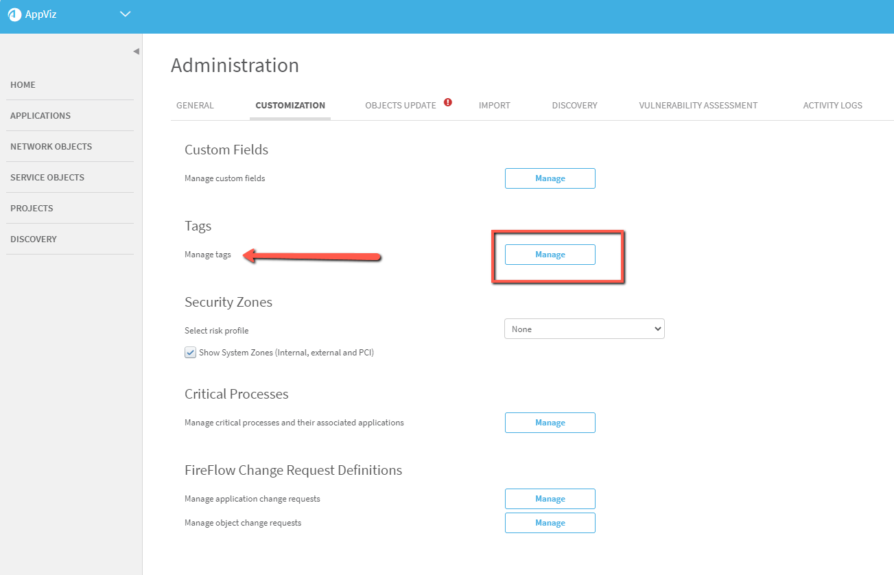 Click on the CUSTOMIZATION tab and then, in the Tags section, click Manage next to Manage Tags.