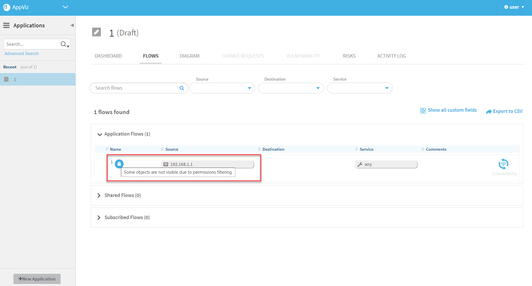 There will be no results in the various searches (Applications, Network Objects, Projects, etc.) if the searched entity is tagged with a tag that is not associated with the user.