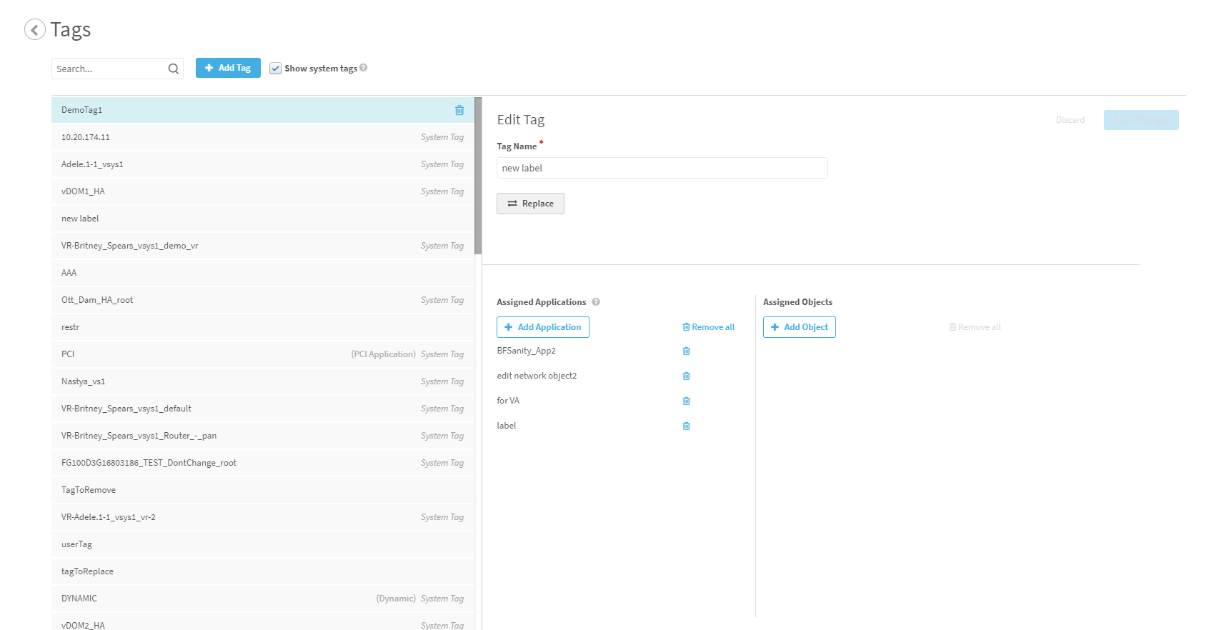 You can use the remove all buttons to disassociate all objects or all applications from the selected tag or you can use the delete icon next to any listed application and object to disassociate that entity individually from its tag.