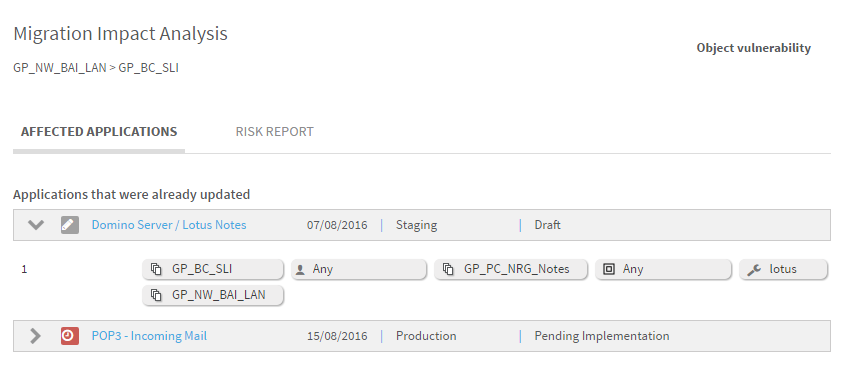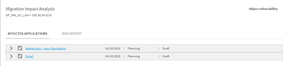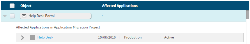 1. To view the affected applications, click to the left of the object.