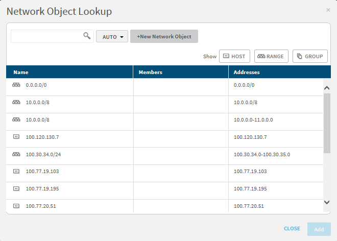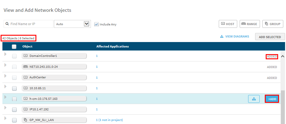 • Select one or more network objects from the list, and click Add.