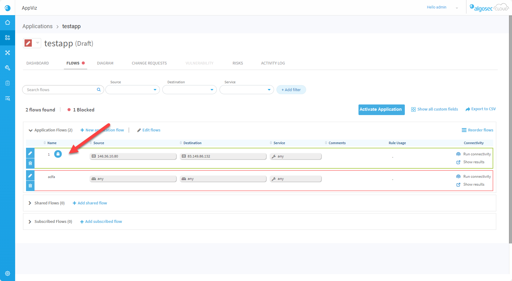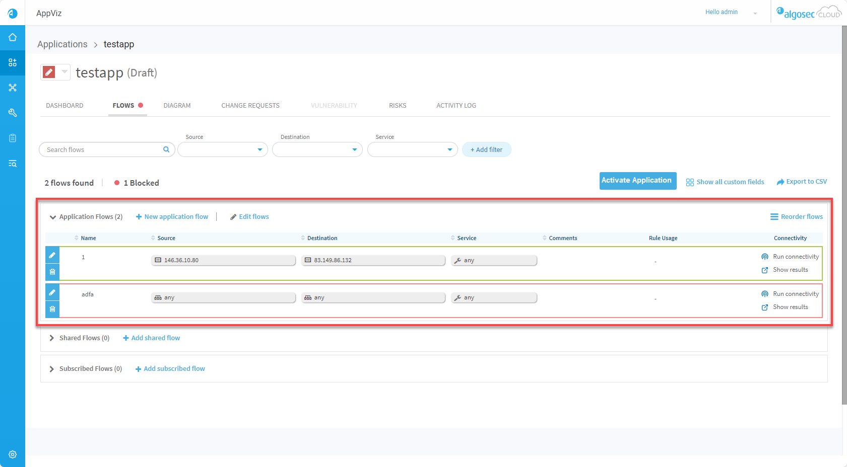 Check connectivity of an application flow by clicking the run connectivity to the right of each flow.