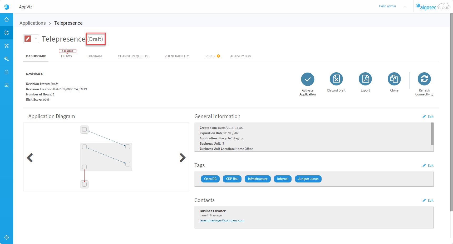 Note: Adding, removing, or editing an application's flows changes the application's revision to draft. After making a change to the application flows, you’ll see the draft status on the Dashboard tab of the application: