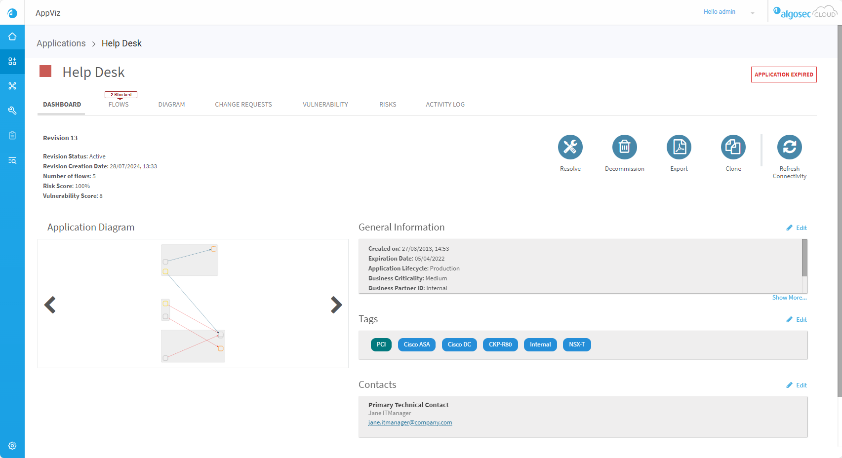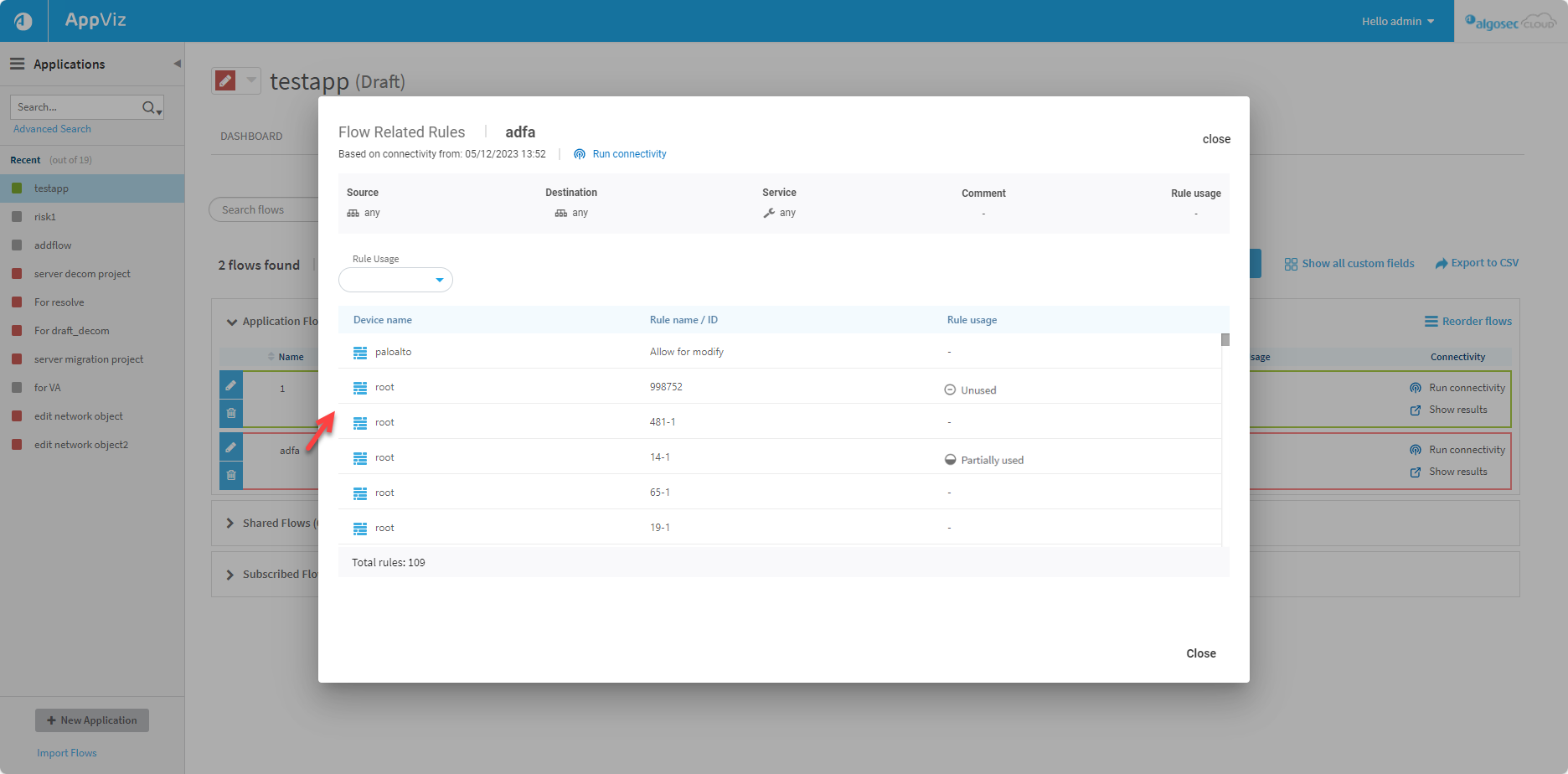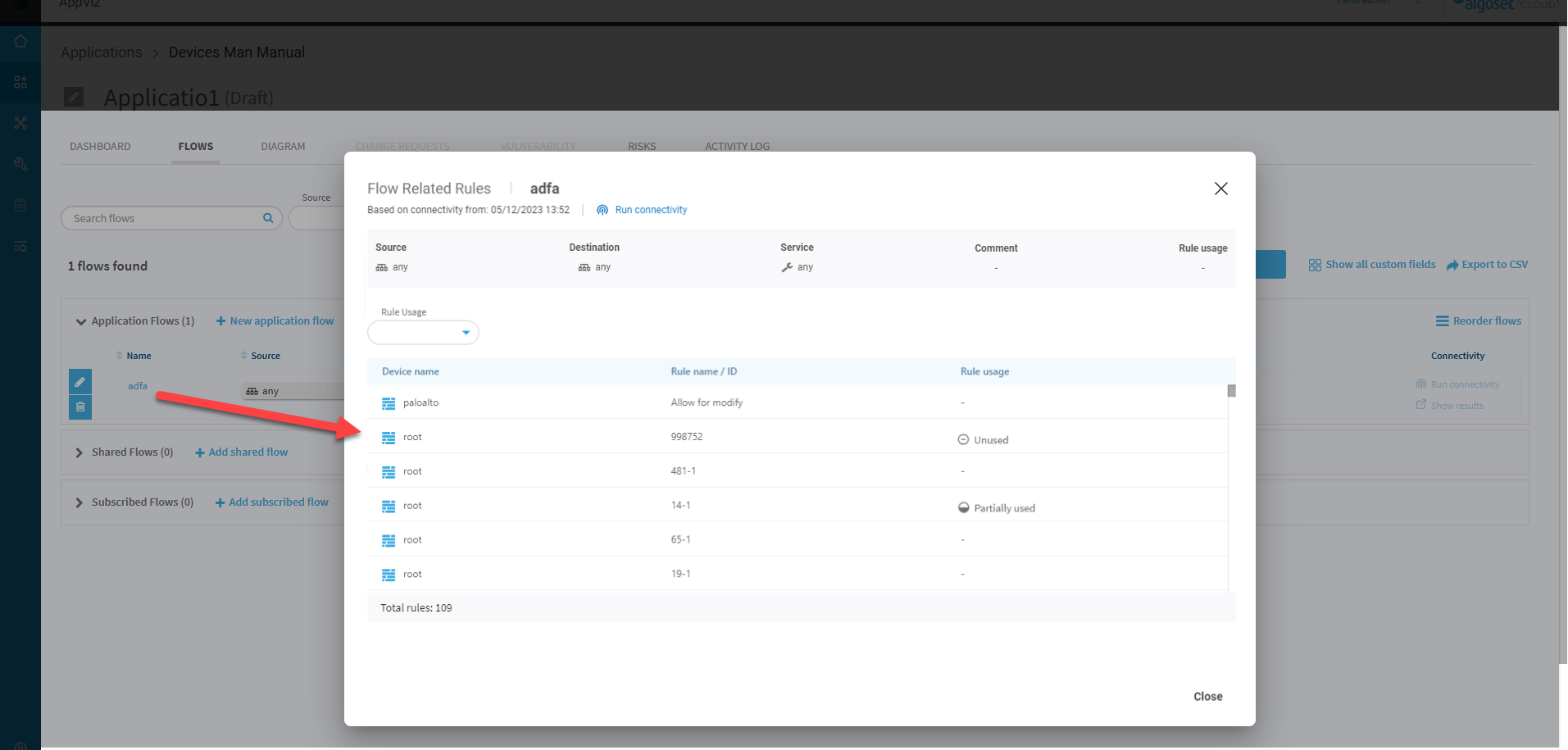 Verifying flow connectivity checks whether the network security policy allows the traffic that the flow specifies. Additionally, it creates and updates the business application field of the flow (a.k.a. rule) visible throughout ASMS systems with AppViz.