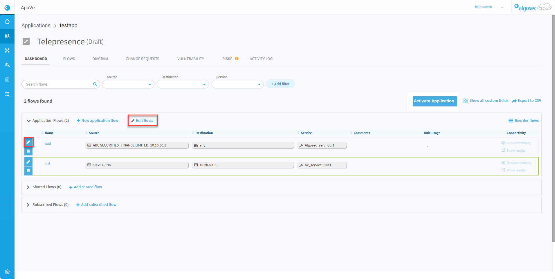 The application's FLOWS tab enables you to manage an application's traffic flows.
