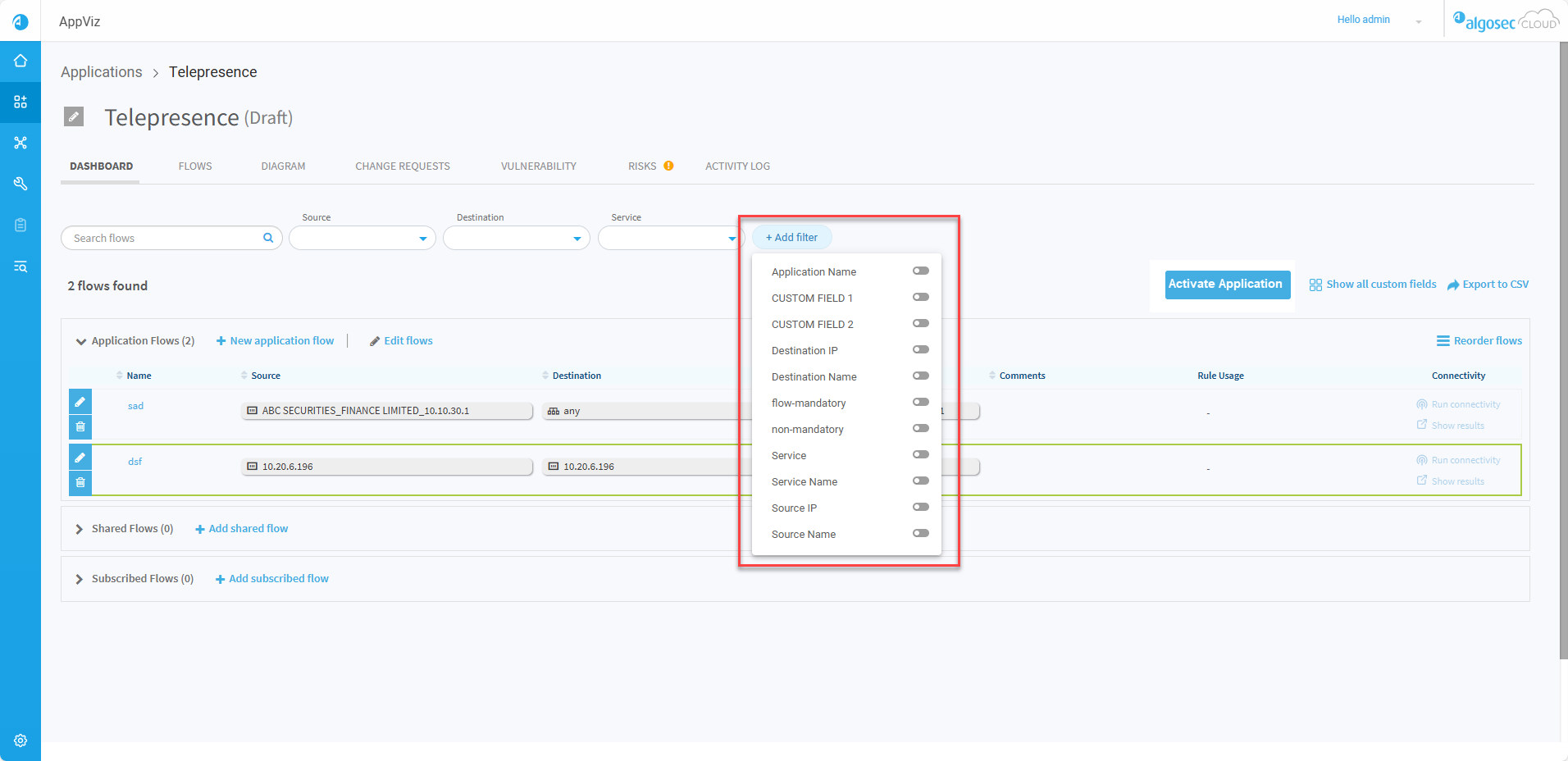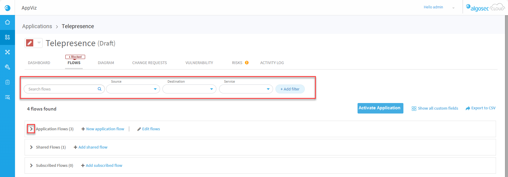 • Use the Source, Destination and Service filters to locate the required flow quickly.