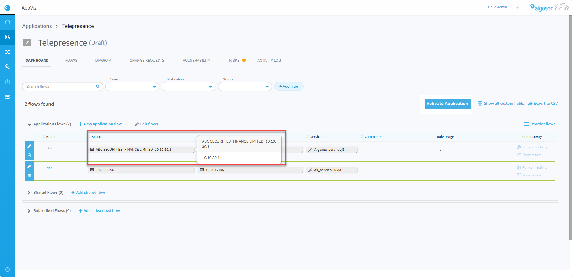 The flow is not updated in the related network security policy until the draft revision is returned to active. For more details, see Activate application drafts.