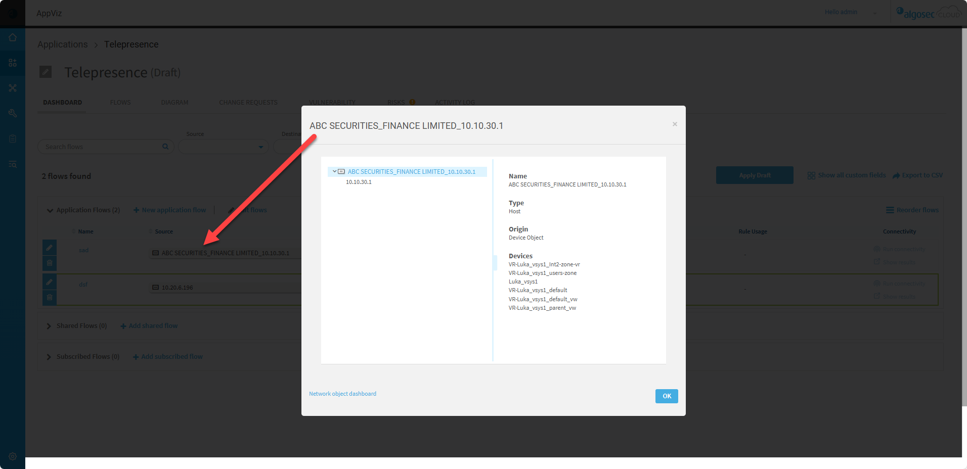 • Click a network object to display further details, including its name, type, origin, and addresses.
