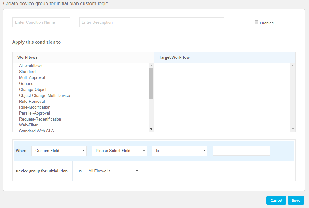 When a traffic change request enters the Initial Plan stage, FireFlow determines which devices are relevant for the change request with an AFA traffic simulation query on a group of devices. By default, the traffic simulation query is always run on the ALL_FIREWALLS group. If desired, you can specify conditions for when the query should run on a different AFA defined device group.