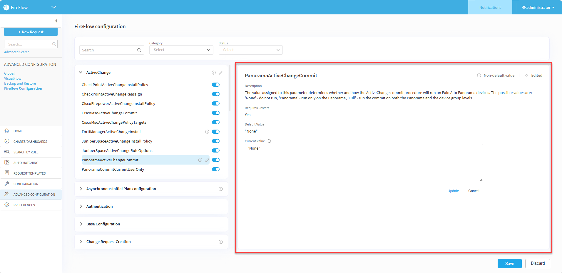 Note: When an edit to a configuration parameter requires restarting FireFlow for the changes to take effect, the Requires Restart field in the parameter details pane shows Yes. After saving the parameter changes, a popup will also remind you to restart the application.