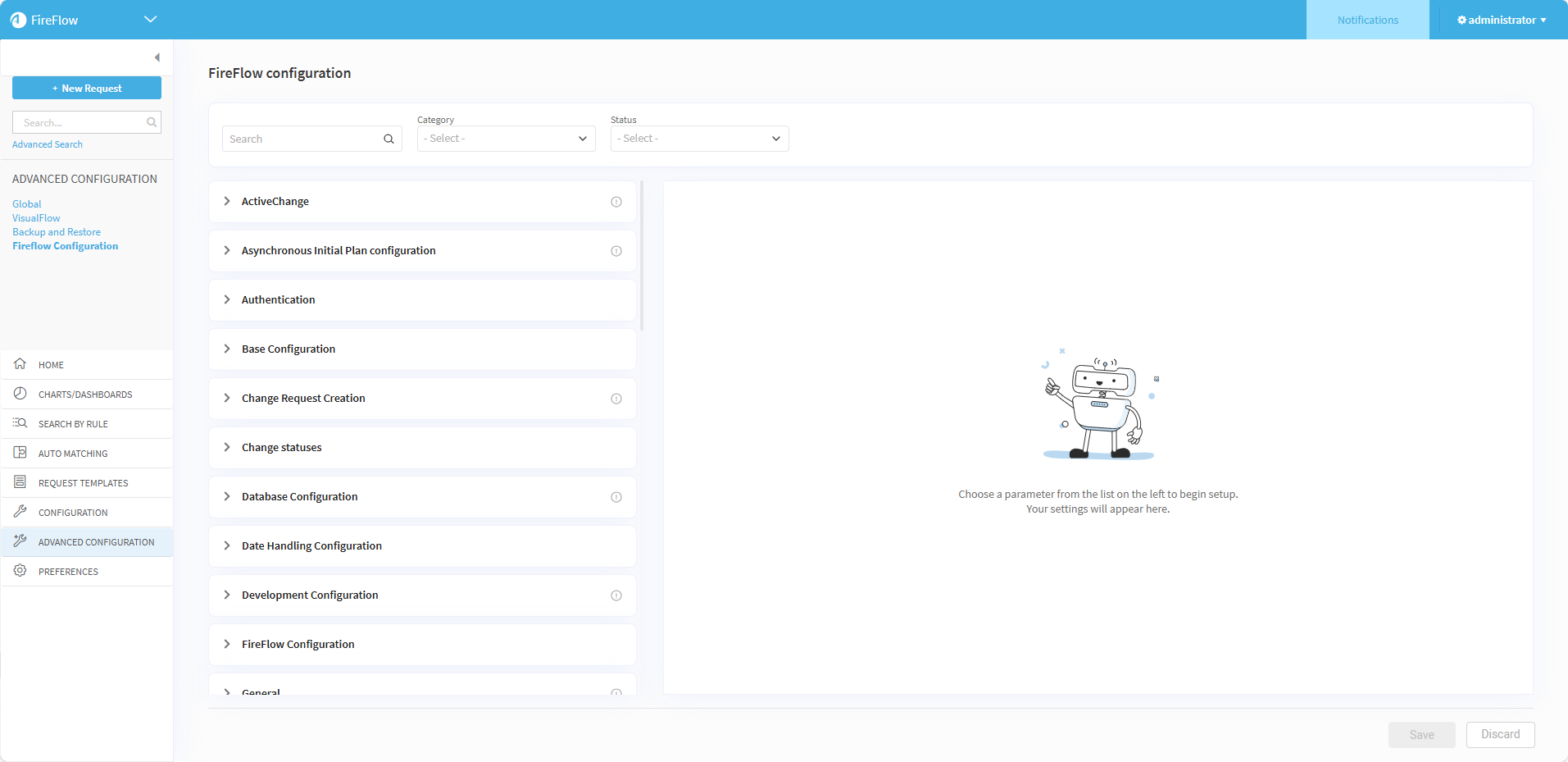 Use the Search field along with the Category and Status dropdowns to filter which configuration parameters and categories appear.