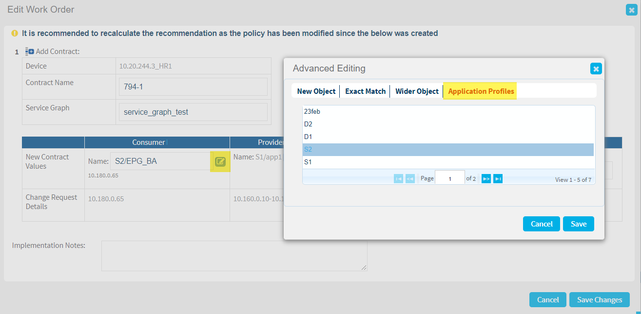 Editing a request for Cisco ACI devices enables you to change details such as rule name, application profile, and service graph, as well as the EPG/ESG values selected for the new rule.