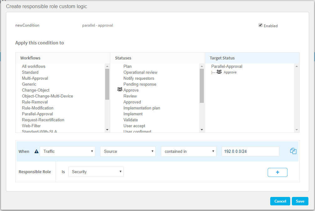 Note: Some statuses support multiple responsible role definitions, allowing you to specify a different responsible role for a slightly different scenario. These statuses are marked with the multi-condition icon: .