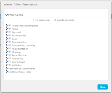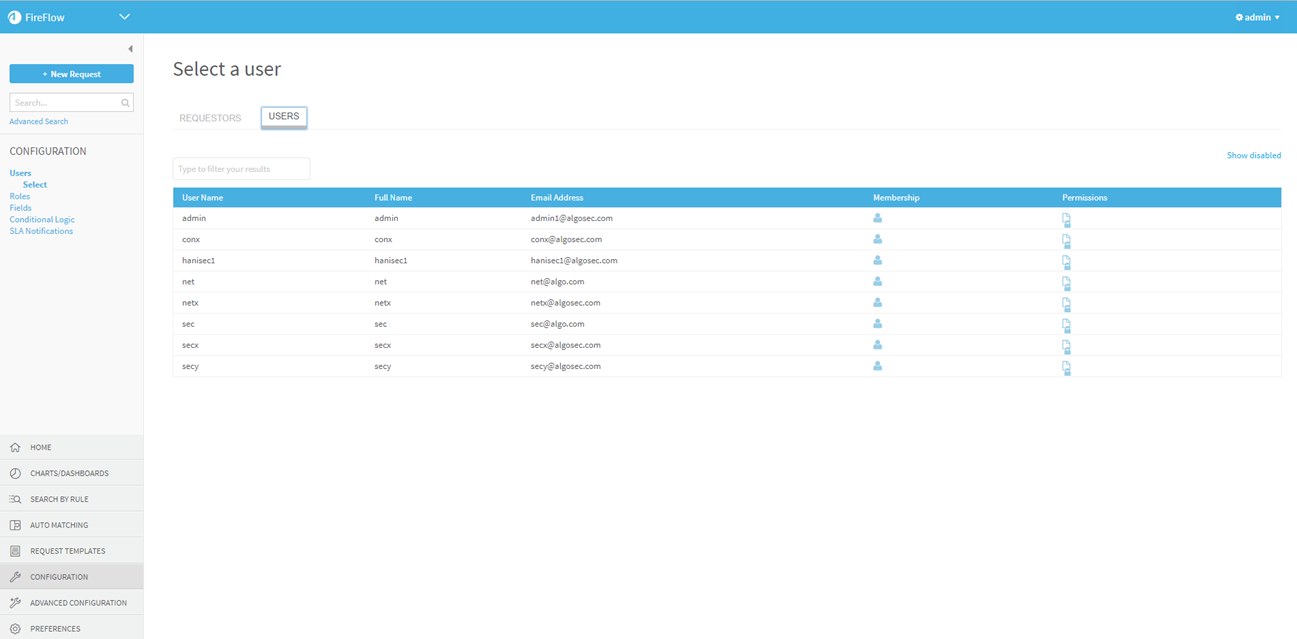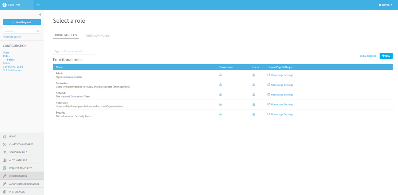 Note: Do not change any of the pre-defined Admin user role's settings. This role consists of the AlgoSec administrators and is only used by FireFlow internally.