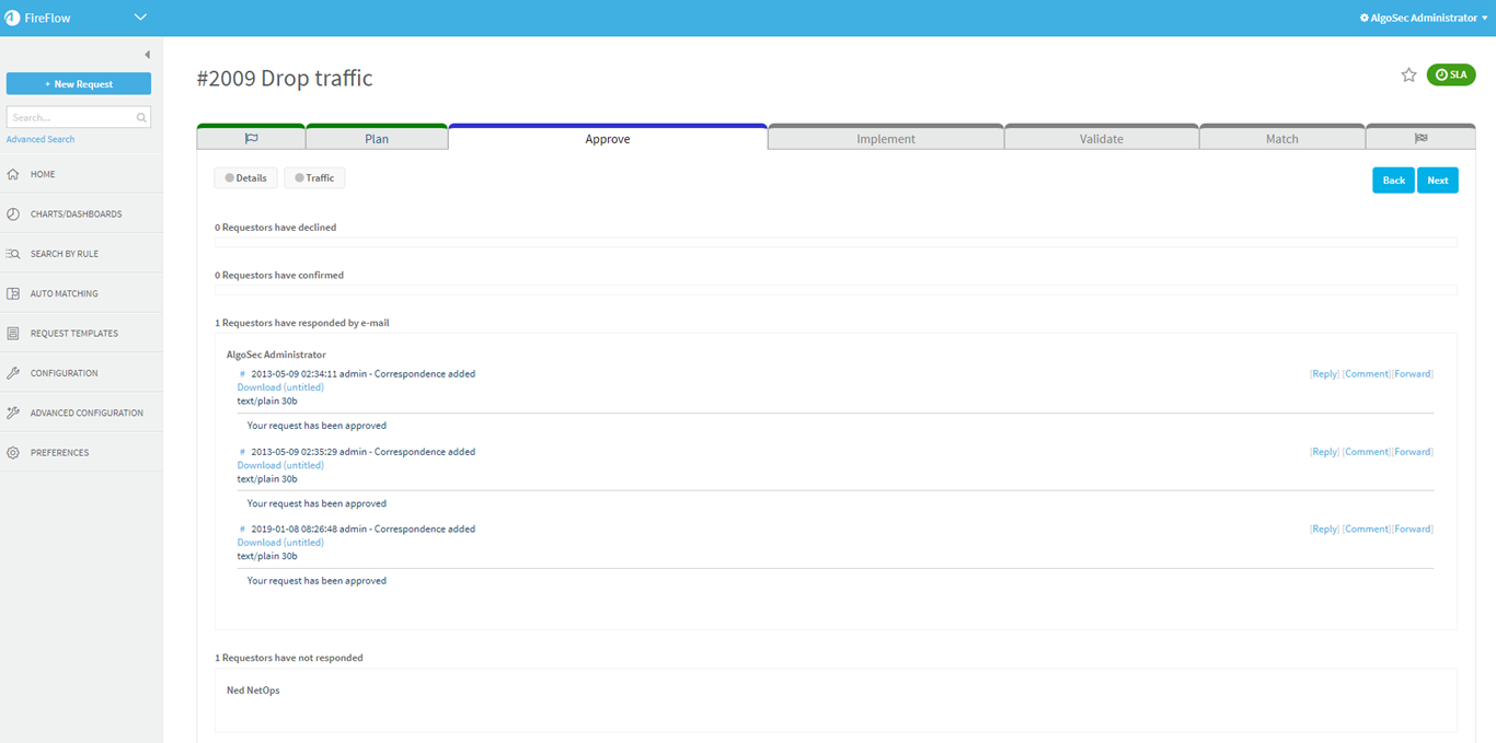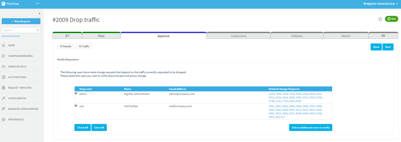 This topic describes how to manage requestor notifications for change requests in the Approve stage, such as traffic change requests with a "Drop" action, rule removal requests, rule modification requests, or re-certification requests.