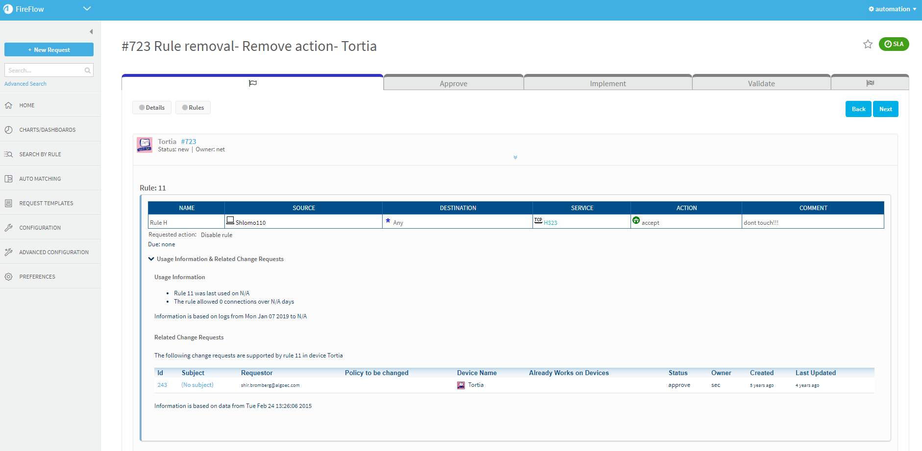 For rule removal requests, the page displays the rule details, information on the rule's usage, and a list of change requests related to the rule.