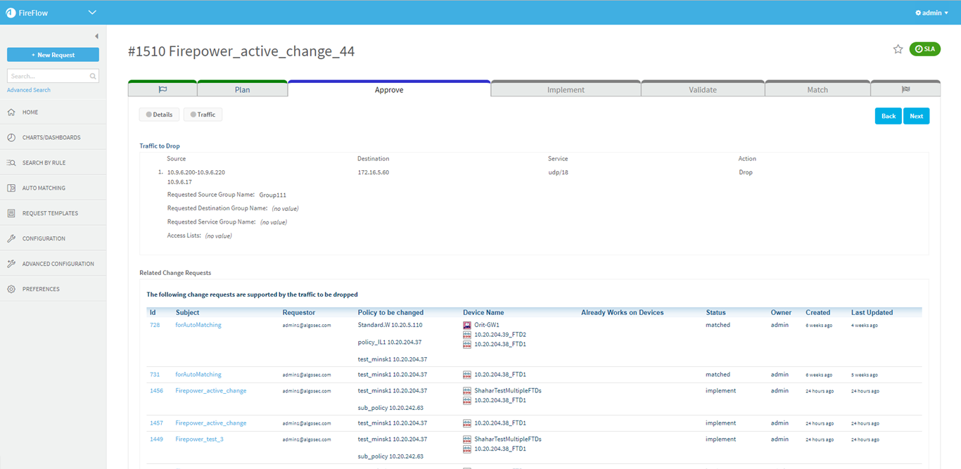 In a traffic change request with a "Drop" action, a rule removal request, or a rule modification request, you can search for change requests whose requested traffic will consequently be blocked. You must then notify the requestors of these change requests that the traffic is slated to be blocked. The requestors have until the change request's due date to respond.