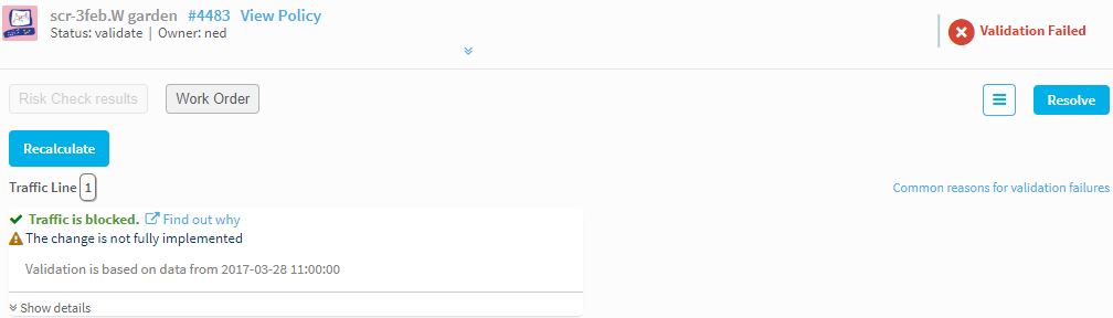 2. The validation process checks both that the requested traffic is not allowed or blocked, and also that the changes were done according to the work order.