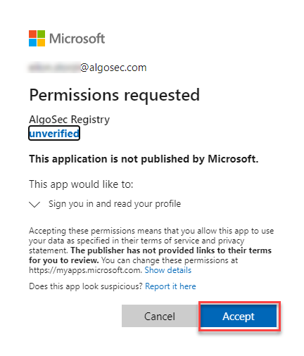 Note: The AlgoSec Registry requires permission: User.Read