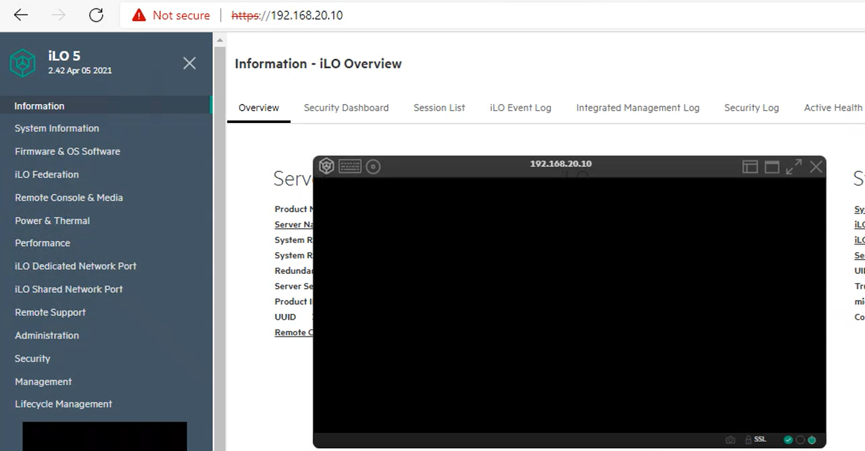 On the displayed iLO overview page, click on the small black screen displayed at the lower left of the screen and select either .NET Console or Java Web Start Console (we recommend you do not use HTML console) from the pop-up menu that is displayed.