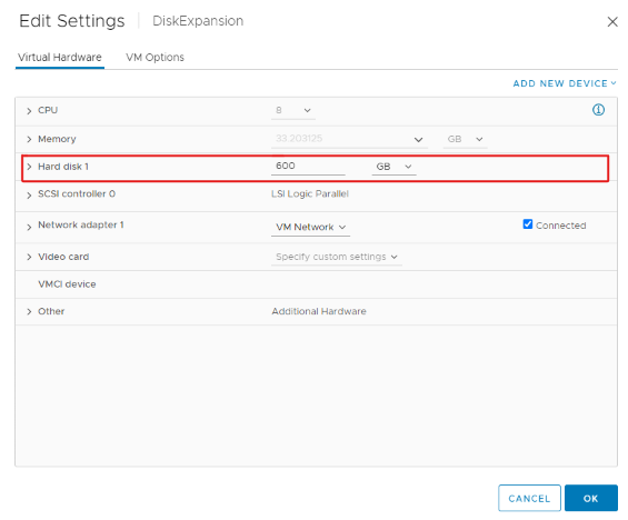 Note: To create disk space over 2TB for your VM, resize the existing disk to 2TB. Then add more disks and follow the instructions below to meet your storage requirements. The first disk is named sda. The second should be named sdb. If a third is needed, it should be named sdc, etc.