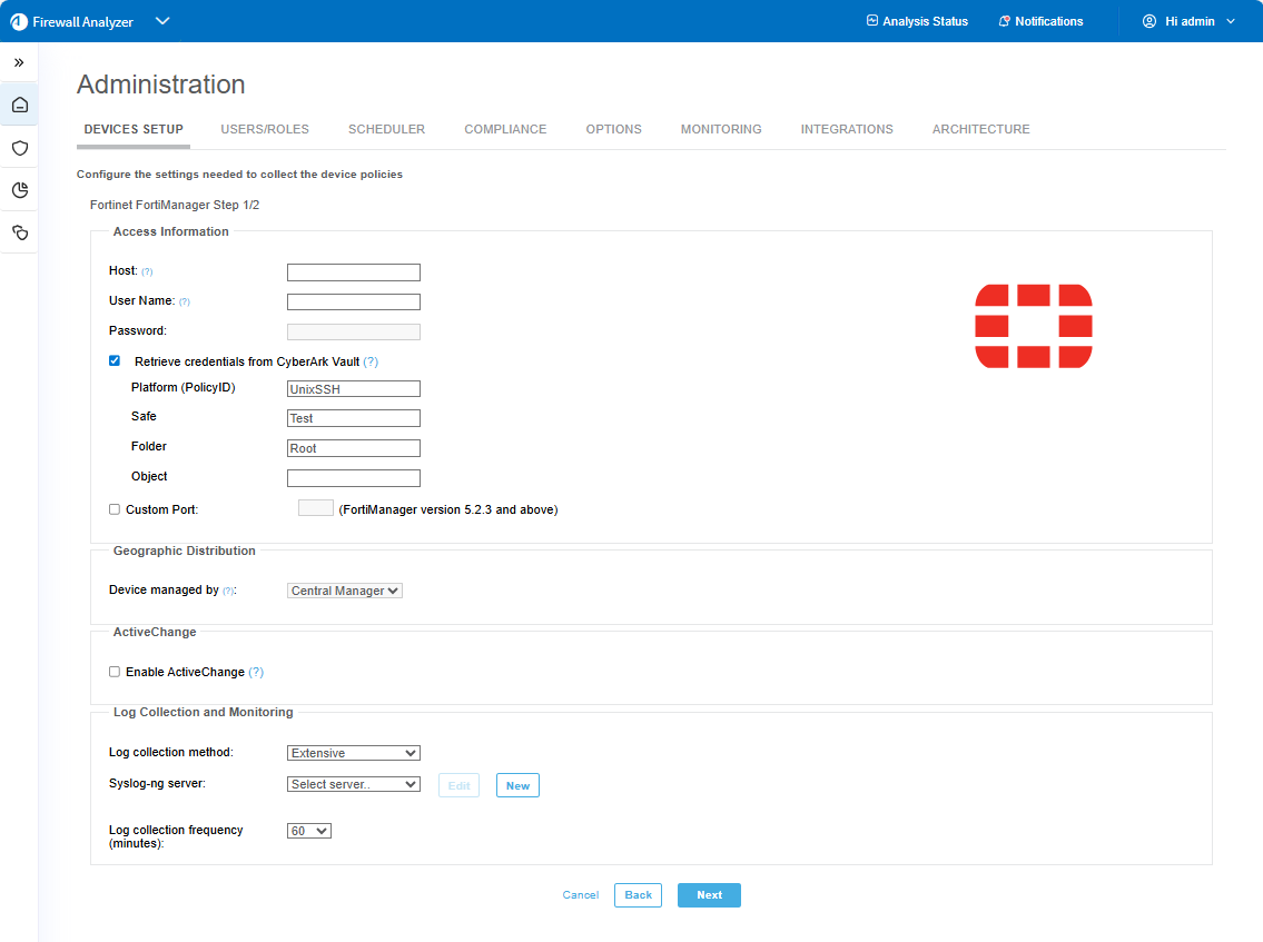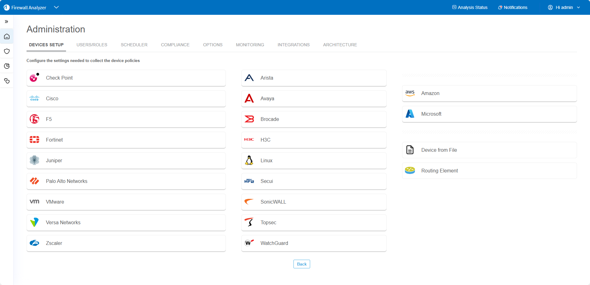 Note: Make sure to open the necessary port between each device and the AlgoSec server, depending on the protocol being used to connect to the device. Note: In the case of a distributed architecture, open the port between the device and the specific Remote Agent or Load Unit managing each device. |
