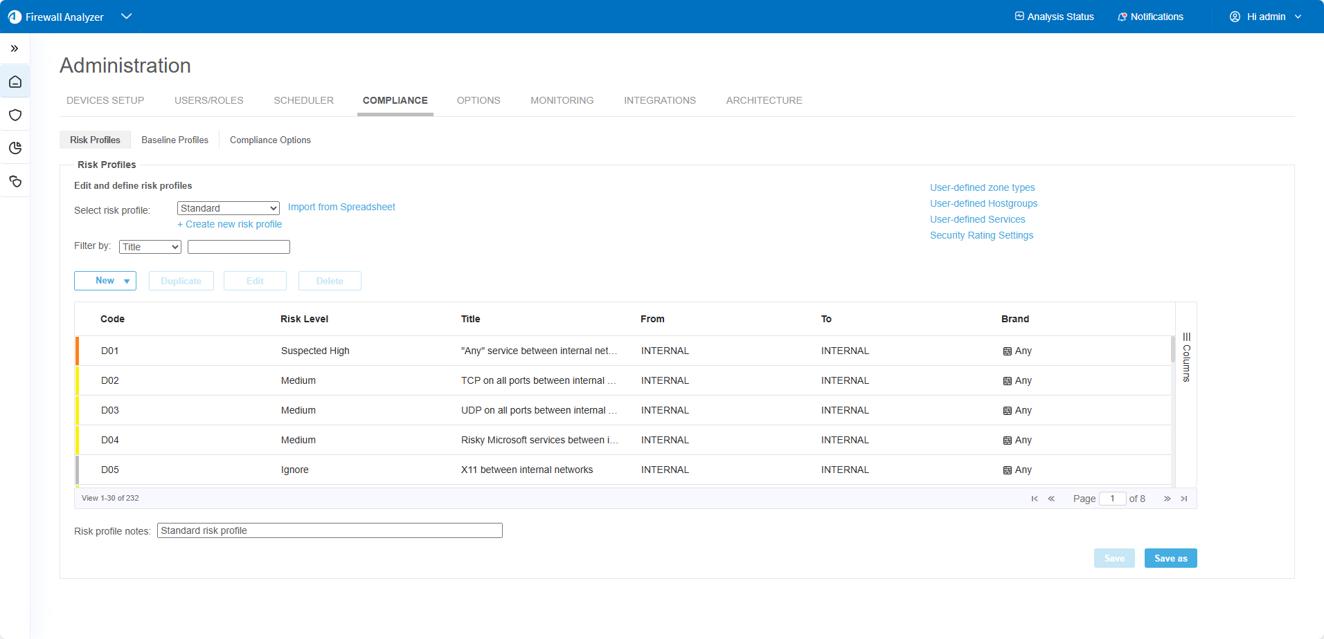 2. Click the ComplianceRisk Profiles tab, displaying the Standard risk profile with risk items displayed in a grid below.