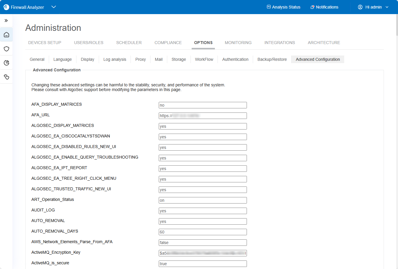 The Administration page appears, displaying the Options tab.