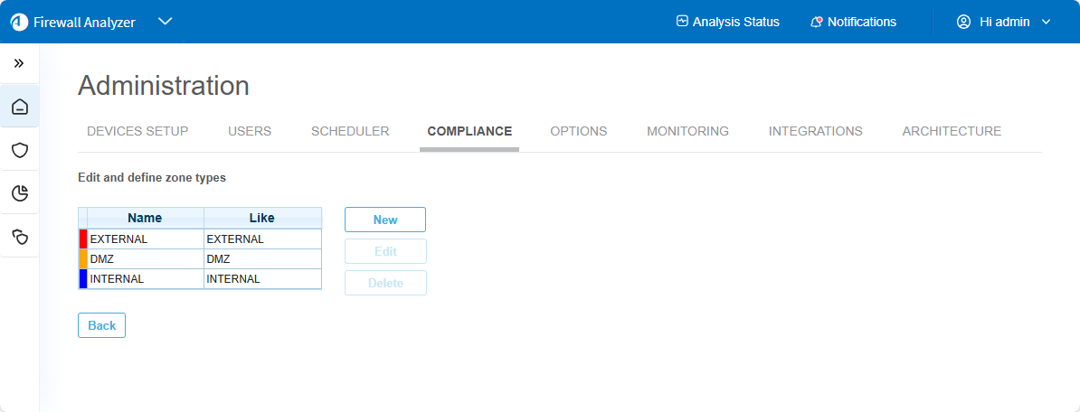 Note: You cannot edit the built-in zone types (EXTERNAL, INTERNAL, or DMZ).