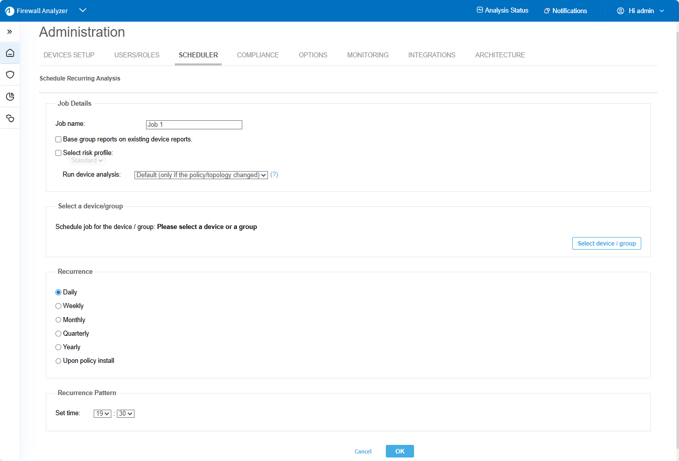 You can select either a daily, weekly, monthly, quarterly, or yearly analysis, or configure the analysis to occur when a policy is installed on the device(s).