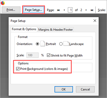 Click Page Setup at the top left, and select Print Background (colors & images).