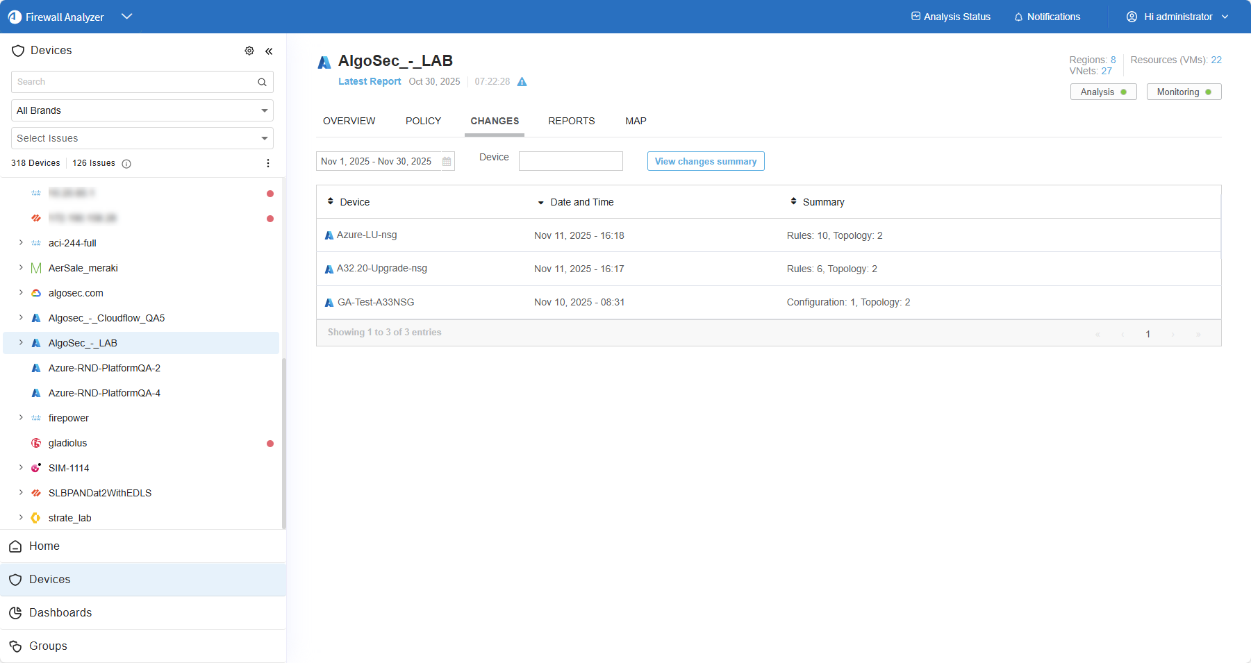 The Changes tab appears, displaying a list of recent changes for the selected device or group.