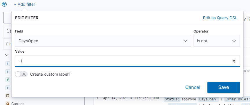 Continue with creating graphs and dashboards. For details, see Visualize data straight from the Discover page, Visualize data, and Dashboards.