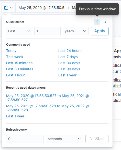 Now Provides quick options, like Today, Previous month, Last 24 hours, or Last 2 years.