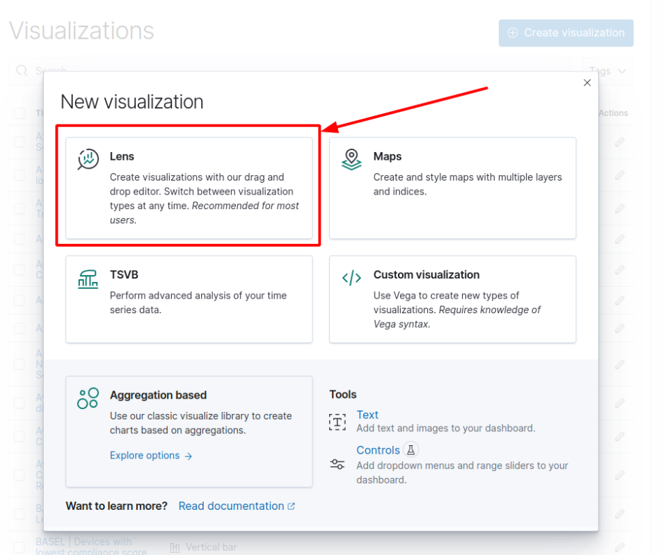 Select a saved search to use as the data set, or select an index to create a new visualization. For more details, see Discover data.
