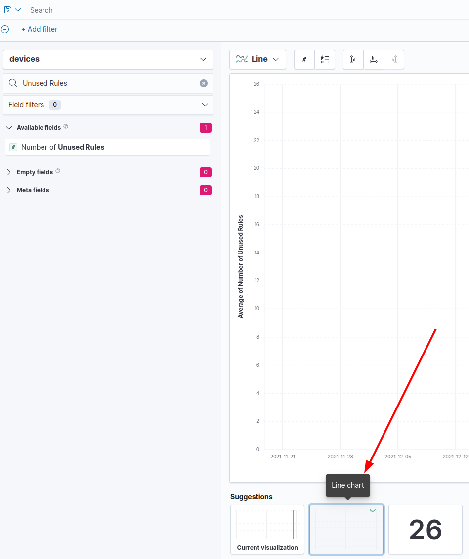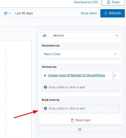 These steps demonstrate how to create a visualization of unused rules per device group along time.