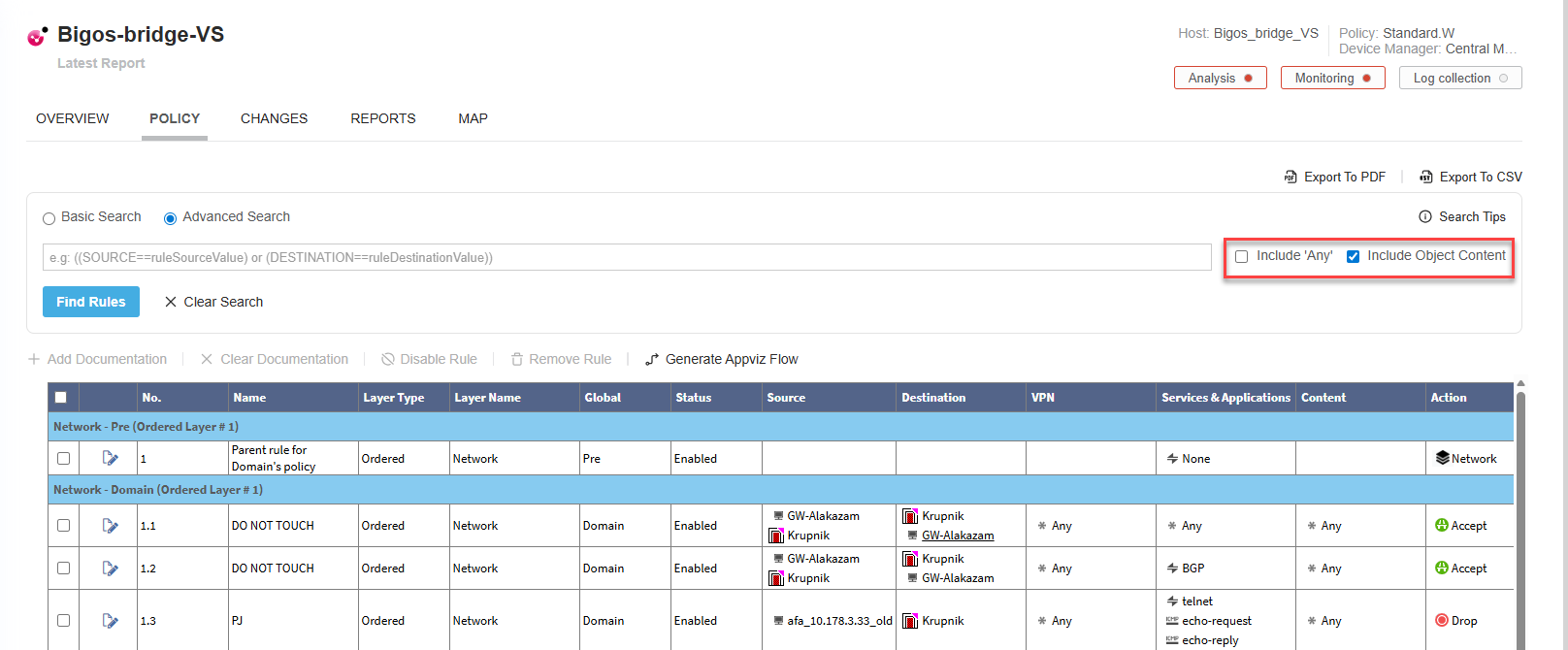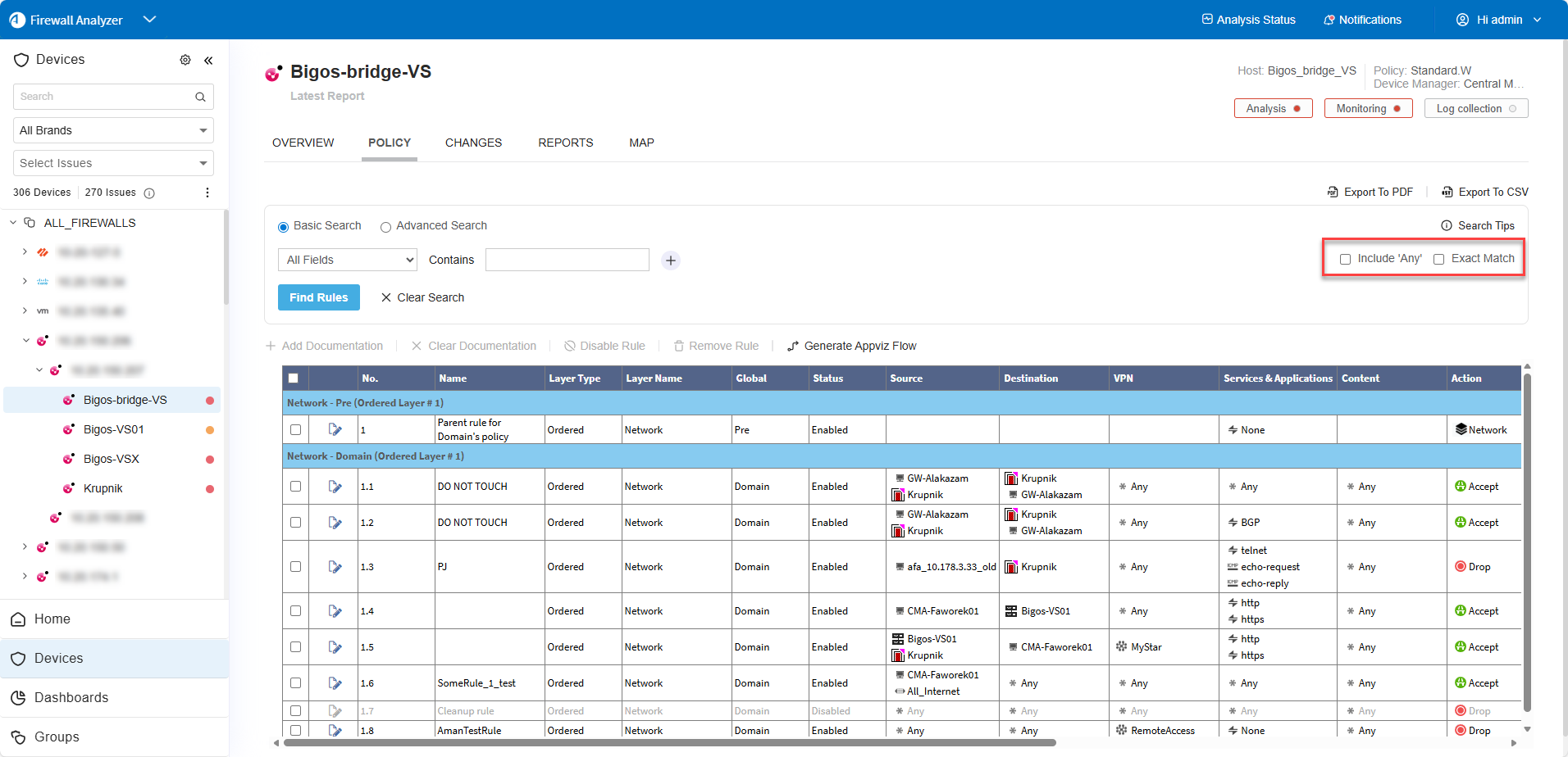 • Select the Include 'ANY' checkbox: To include results which contain the searched IP address(es) or service(s) only because they contain "any", "all", or "*.