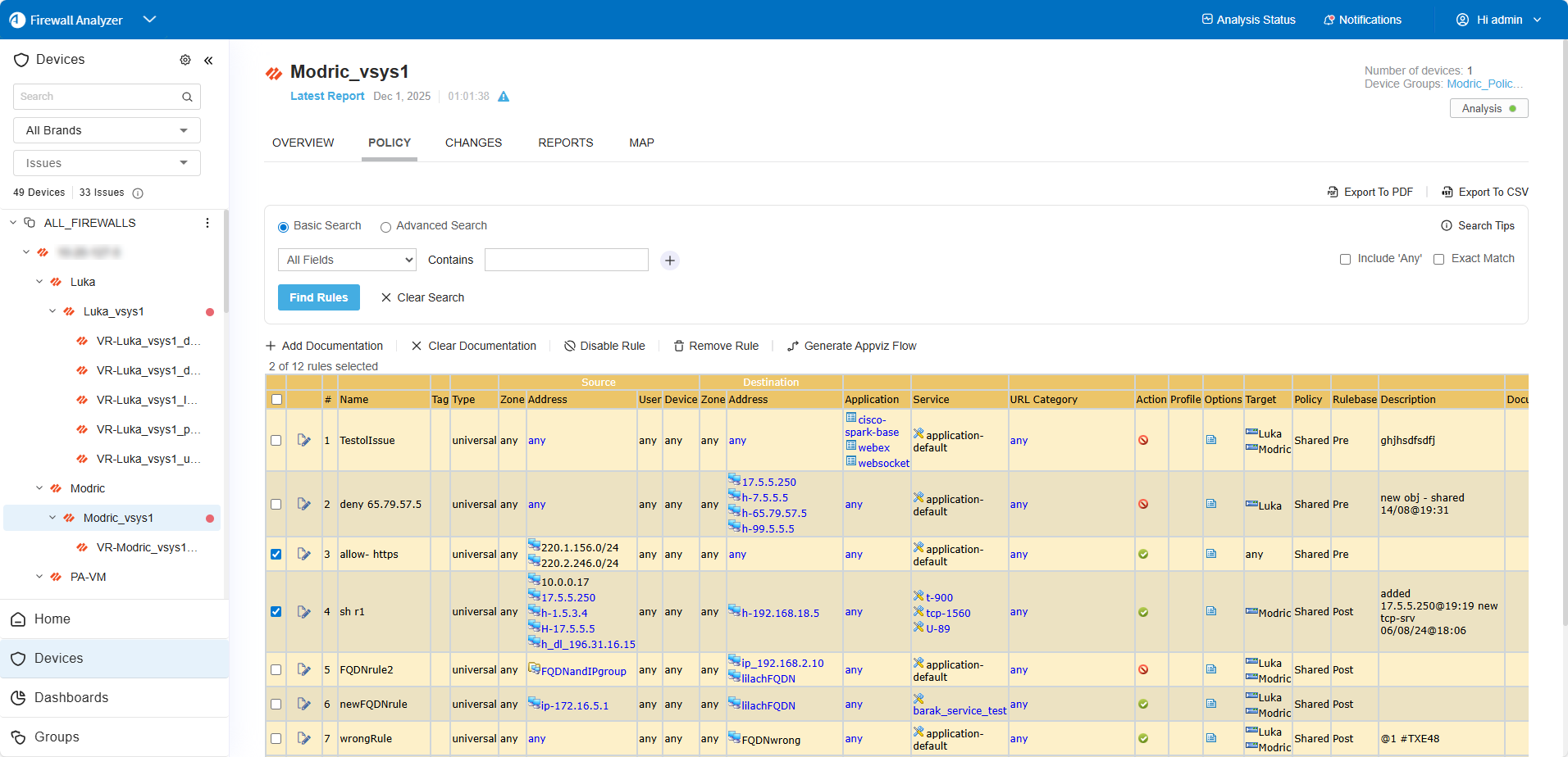 Note: In case of a group policy search that involves multiple brands (i.e. All_Firewalls), only one device can be selected at a time for rule disabling or removal.