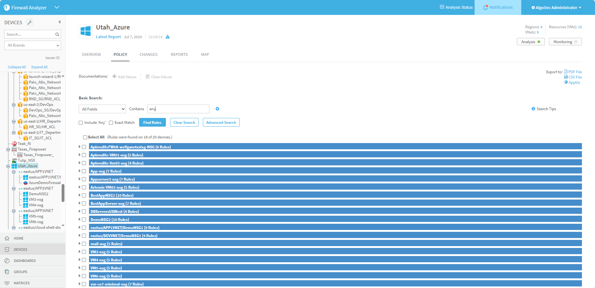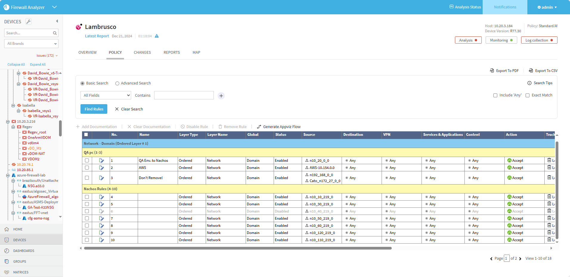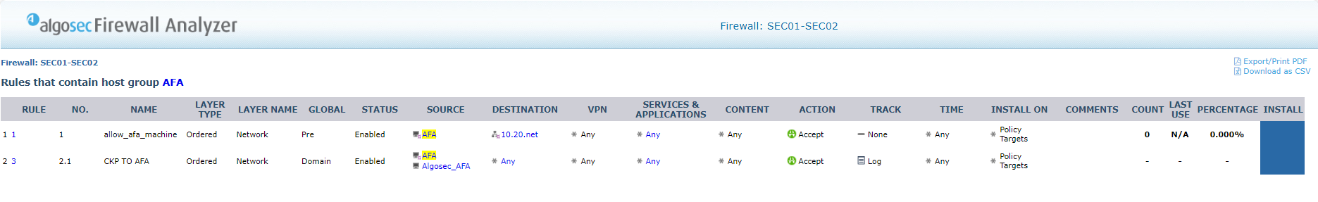 You can select rules from a device's policy in AFA, and export them as application flows in AppViz. Either transfer the flows directly to AppViz, or download a CSV file to analyze or edit and then import into AppViz.