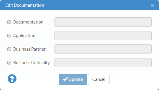 • AFA administators can disable or enable the Documentation field and/or custom documentation fields. For details, see Enable/Disable documentation fields.