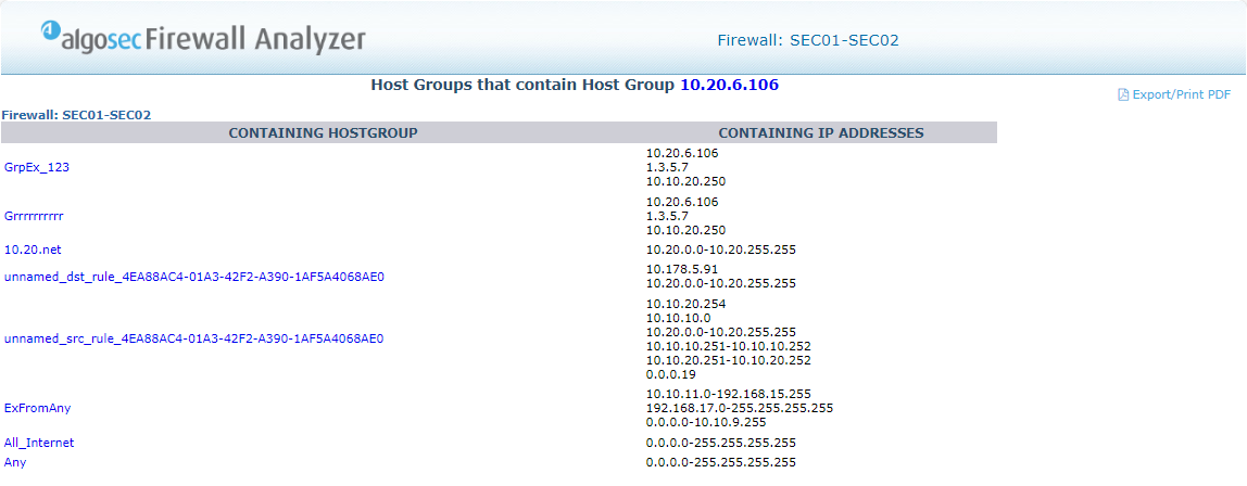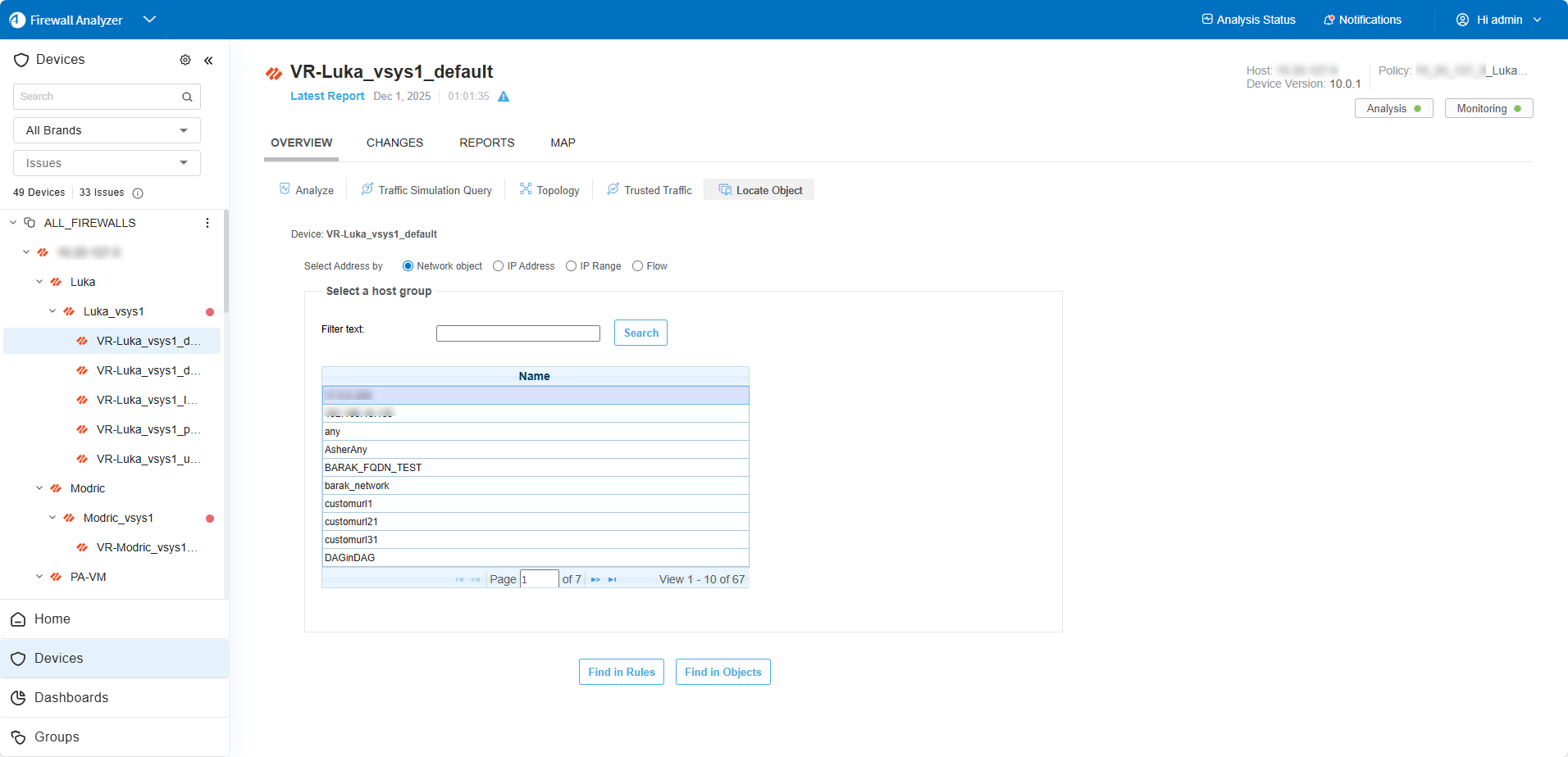 A new window opens displaying a list of objects with the specified IP address, range, or host group, in the specified devices.