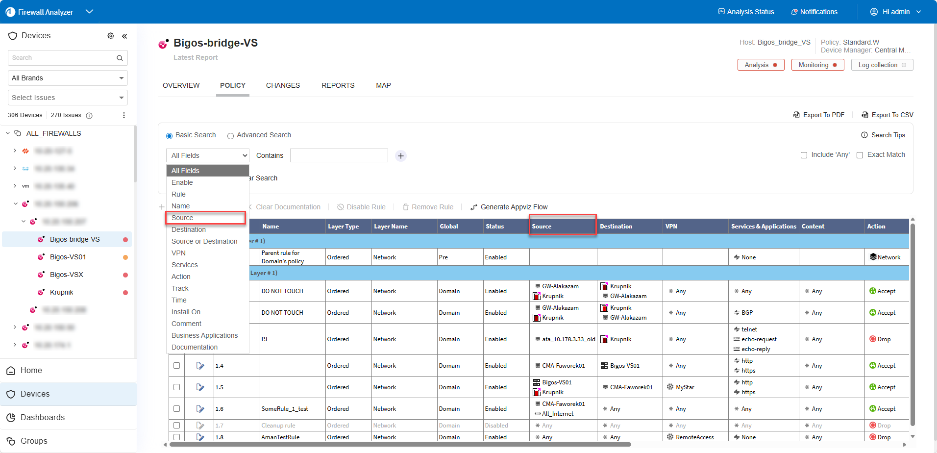 3. The dropdown options are specific for each device brand. Because Source, Destination, Source or Destination, Services, or All Fields can also have objects containing rules or other objects, searches in these fields also evaluate the nested objects as well for matching rules.
