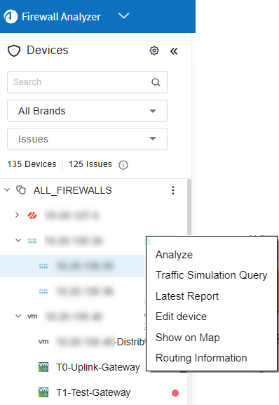 Additionally, Palo Alto Networks Panorama devices and any Juniper SRX devices that are configured to display virtual routers, VRs appear as the last tier in the device tree.