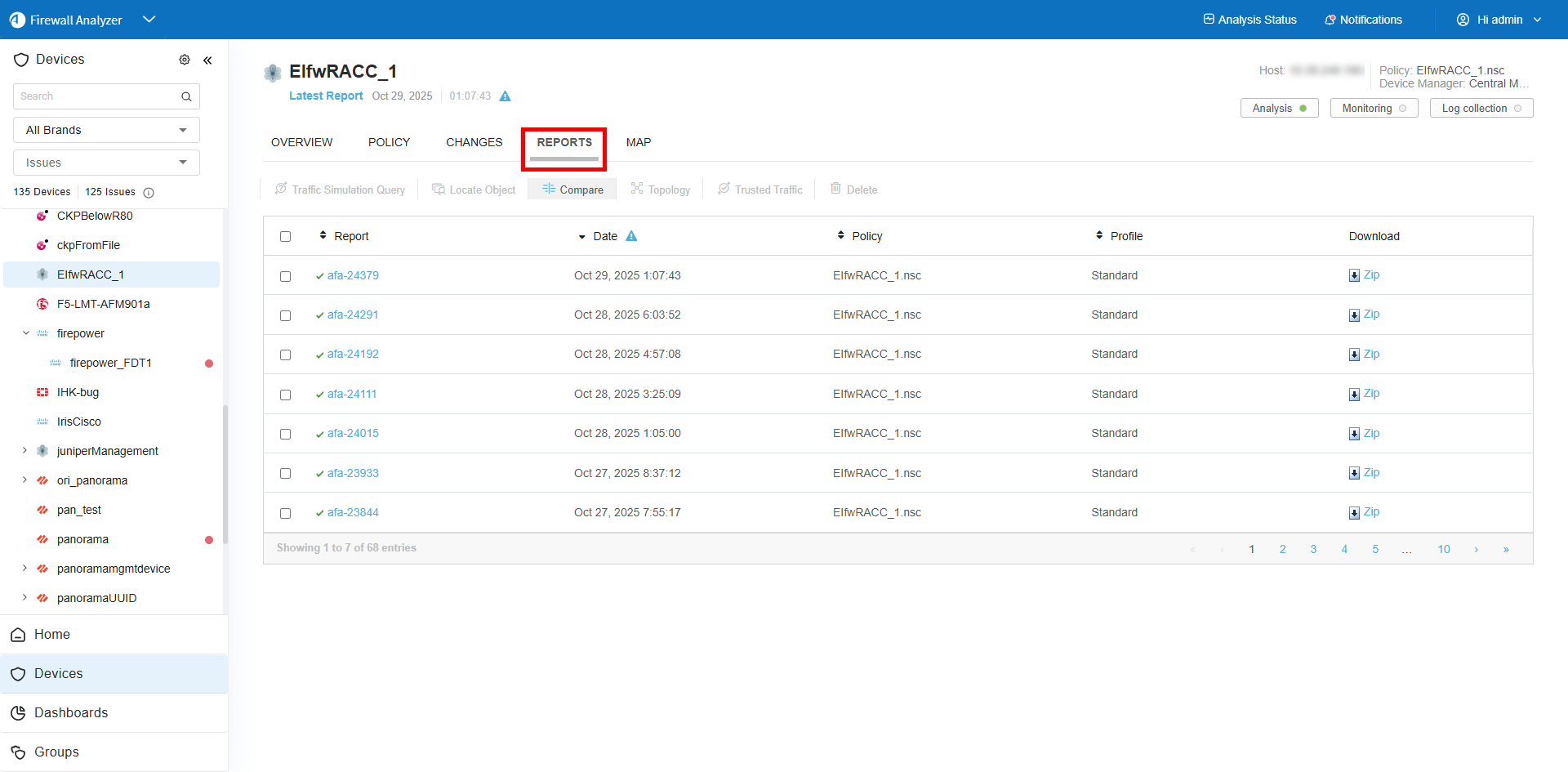 Changes. Displays the changes in rules, objects, and the resulting changes in allowed traffic and risks, over all the history of AFA reports for this device. For details, see CHANGES page. |