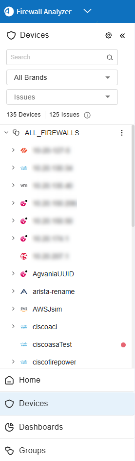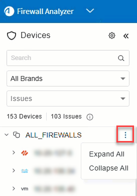 located to the right of ALL_FIREWALLS in the tree. This opens open a dropdown with Expand All and Collapse All options.Tip: By default, the device tree is collapsed. This is controlled by the parameter CollapseDevicesTreeOnLogin=yes. To configure tree to be expanded by default, set CollapseDevicesTreeOnLogin=no. See CollapseDevicesTreeOnLogin.