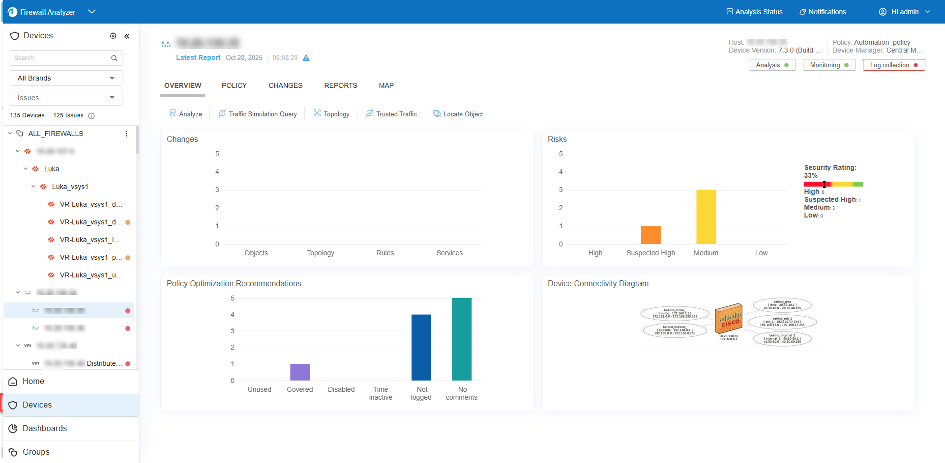 Risky Rules. Provides a list of all the risky rules (vs. the actual risk displayed in the summary page) found in the device policy, along with links to all the risks to which each rule contributed. Available only with the AFA Risk and Compliance Module. For details, see RISKY RULES page. |