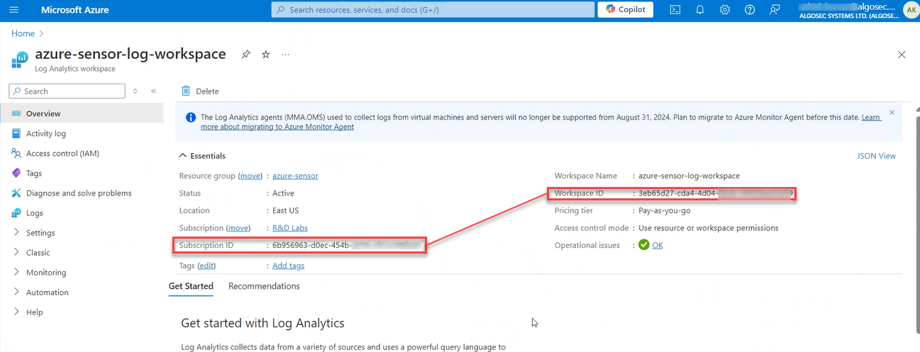 2. Set Workspace ID(s) per subscription: For each Azure subscription, configure the Workspace ID for the Azure Traffic Sensor, by editing the properties file located at /data/algosec-ms/config/ms-aad-azure-sensor-prod.properties.