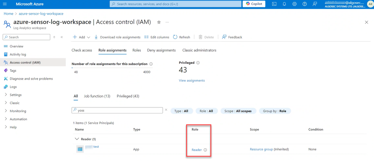 2. Enterprise Application Permissions: The Enterprise Application as defined in the Azure Portal must have at least the "Reader" role to access the resource group containing the Log Analytics workspace ID.