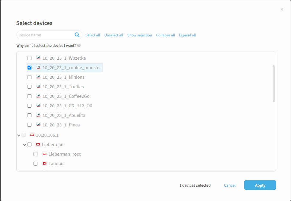 To keep the device selections displayed including your last changes, click Apply, or click Cancel to revert to the last applied selected devices configuration for the network object.